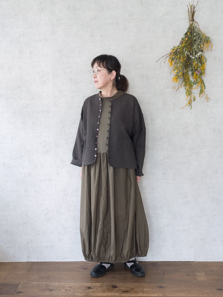 緩いカーブを描いたような膨らみのあるバルーンシルエット、ふんわりとしていますが裾がすぼまったデザインなので広がりすぎず程よいボリューム感でコーディネートに取り入れやすいワンピースです。