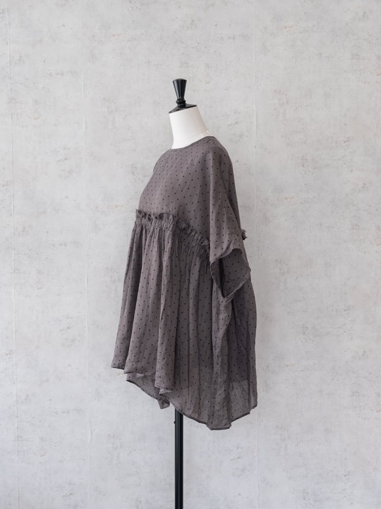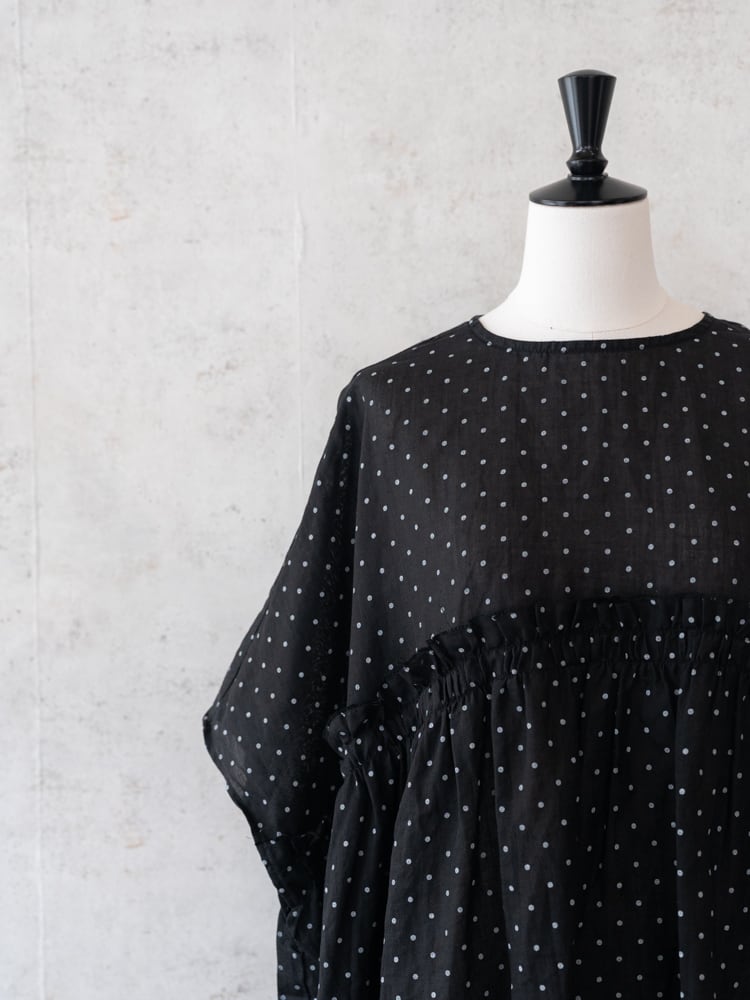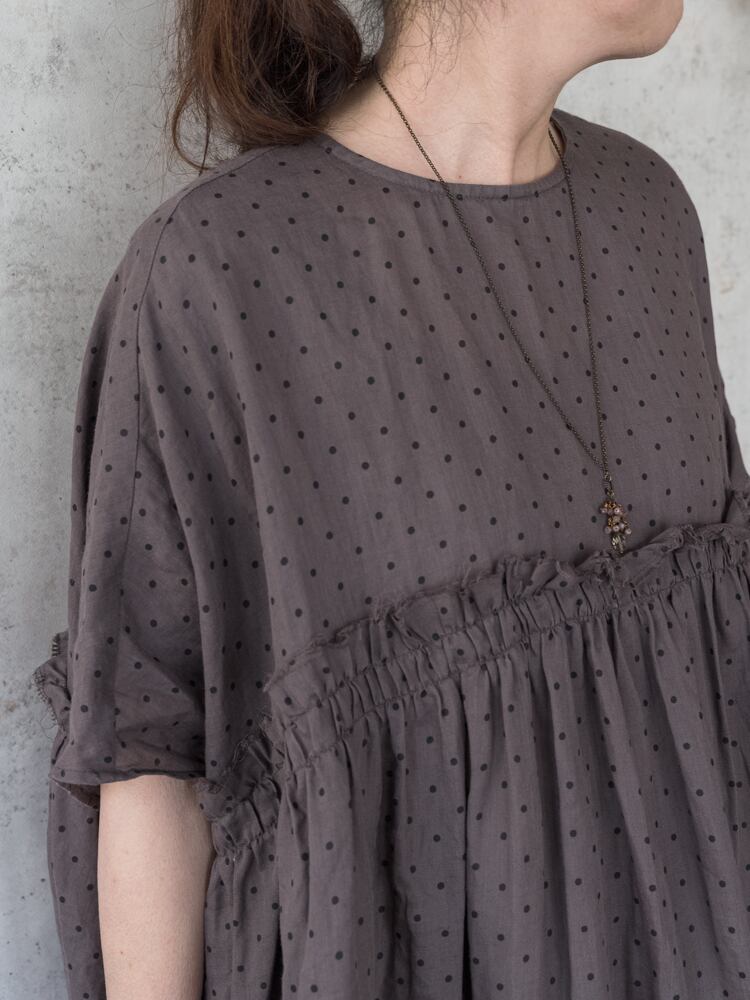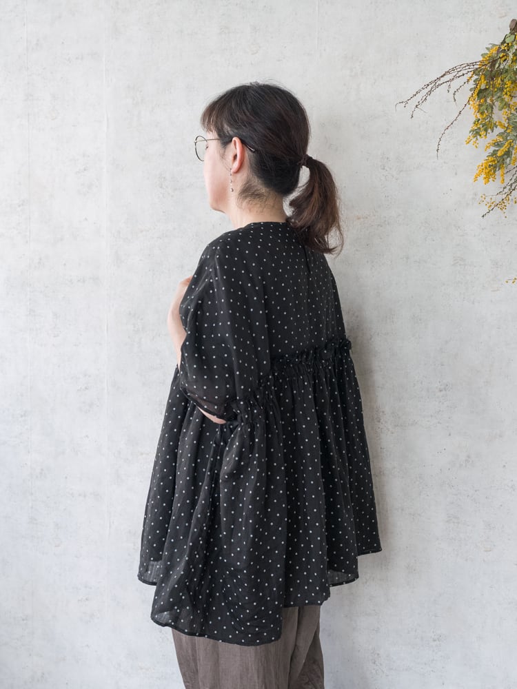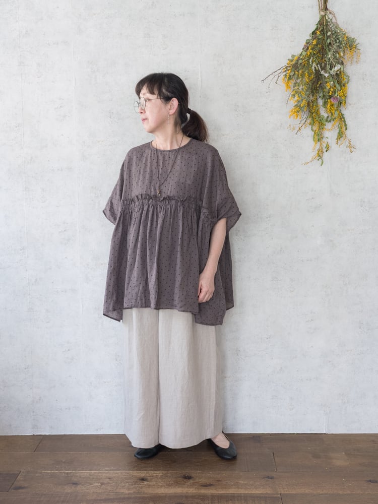 G1169 ラミーリネン素材のスモールドット生地を贅沢にたっぷりと使ったワイドシルエットのブラウス。 胸元の切りっぱなしのフリルが大人ナチュラルな可愛いアクセントに。 ワイドシルエットの両サイドの下がる特徴的なシルエットで一枚でもこなれた印象になり、シンプルなボトムでも雰囲気のある着こなしに。 ・SIZE : ONE SIZE ・身幅86cm 着丈71cm 肩幅88cm ・ラミーリネン100% ・made in japan * 着用モデル 身長155 cm