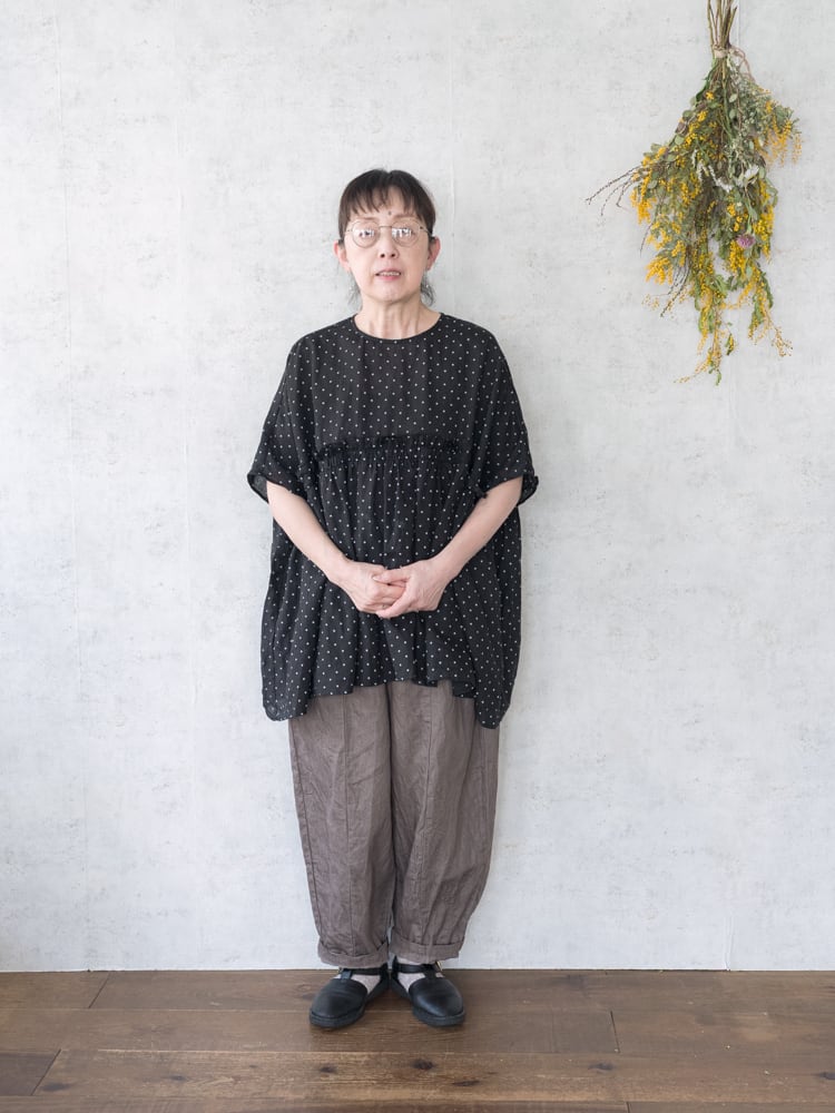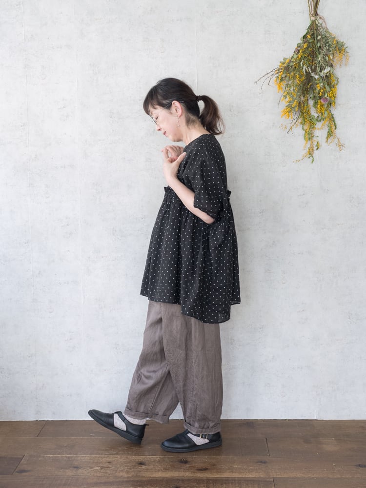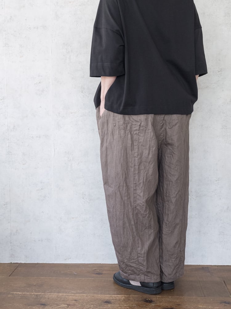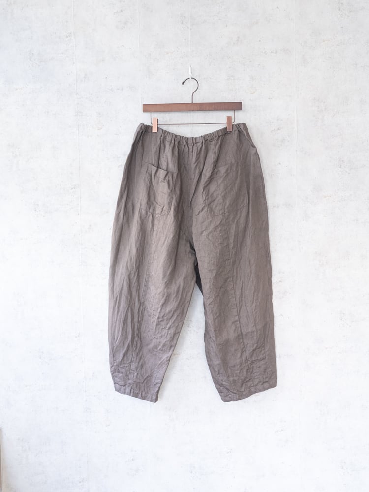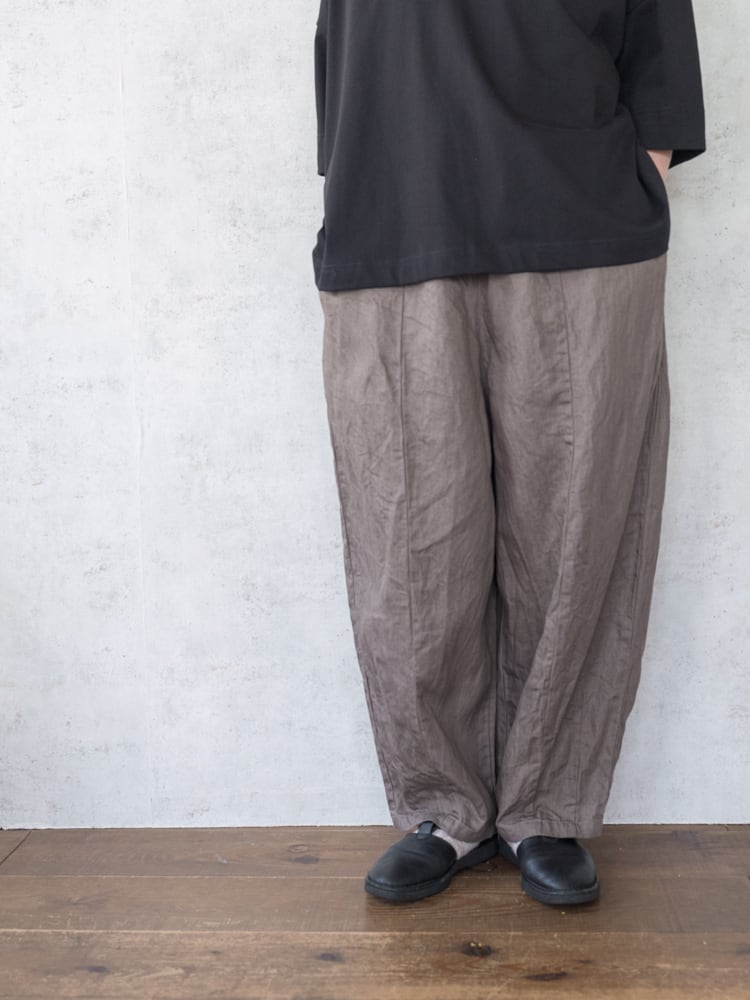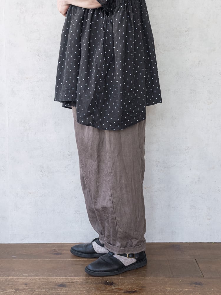G943M ガーゼの人気定番パンツ、チャーリーパンツの新色のモカデニムが入荷しました。 ゆったりとした膨らみのあるシルエットながらもコーディネートに馴染みがよくて合わせるアイテムを選ばないガーゼらしい秀逸シルエットなパンツです。 新色のモカデニムは赤みが少なくグレーっぽいモカカラーでダークトーンにも相性がよく使いやすいカラーです。 ・SIZE : ONE SIZE ・ウェストフリー 股上40cm 股下36cm 裾幅22cm ・コットン65% リネン35% ・made in japan