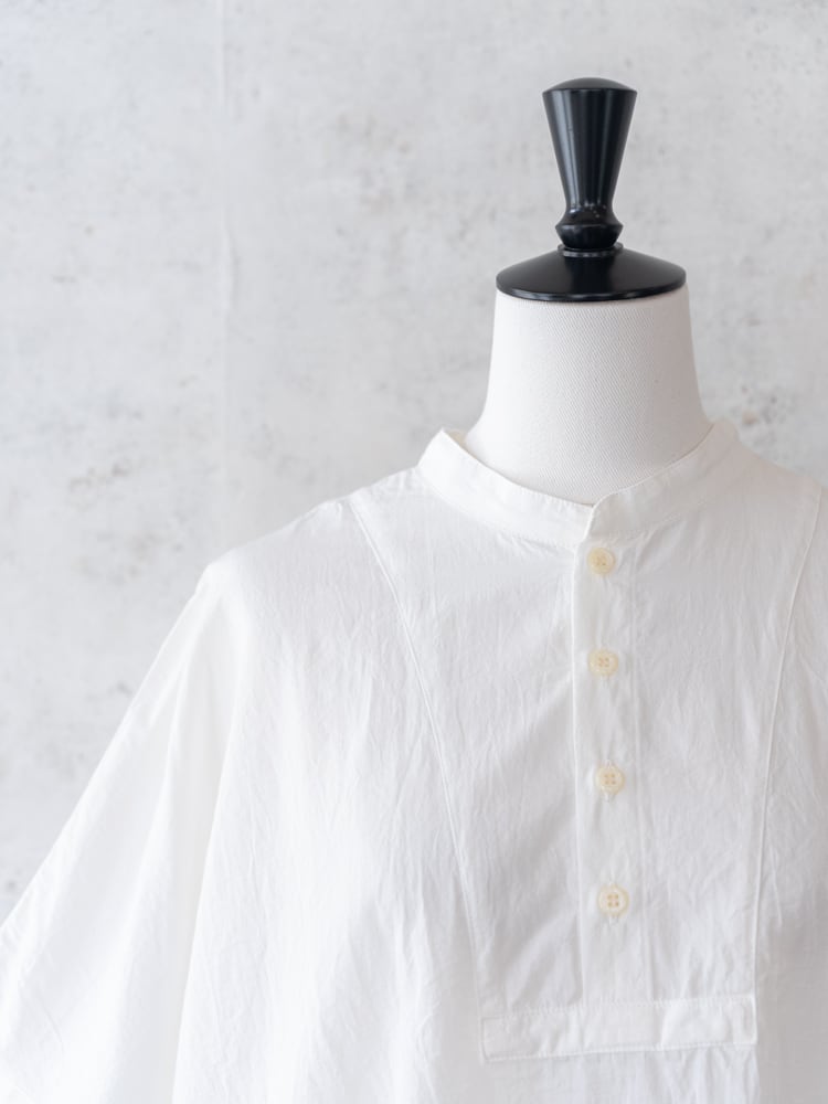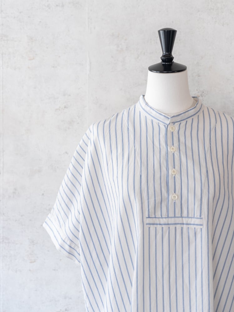 胸部分(ボザム)に施したデザインが特徴的で、裾は白いパイピングを利かせることでちょっとしたディティールポイントになっています。カフスを付けた袖口に加えて後ろヨーク(切り替え)はストライプの向きを変え、3本のタックを入れるなど細部にこだわりを感じることが出来る一着です。