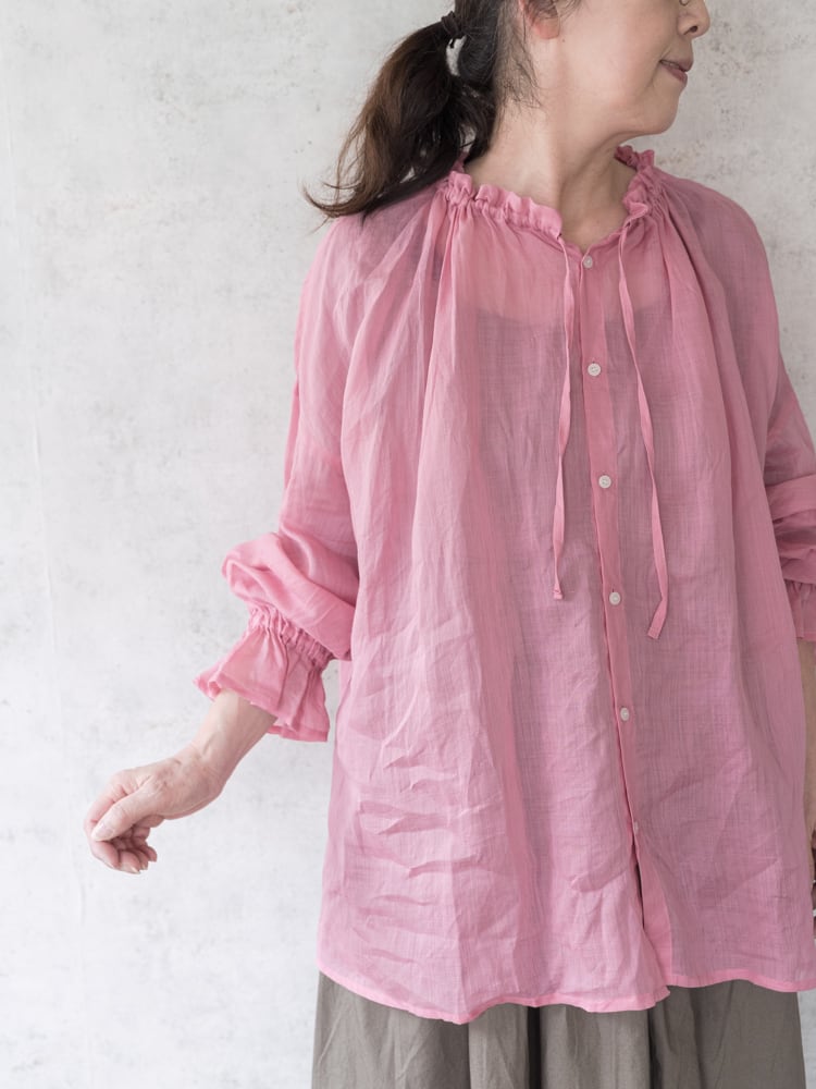 細くて繊細なラミー糸を使用した透け感のある薄手で上品なシアーブラウス。