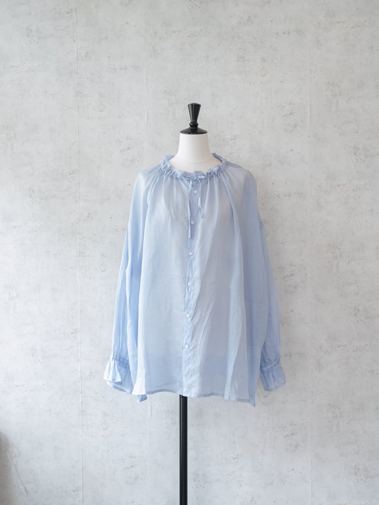 素材のシアー感によって透明感のある爽やかで涼し気な雰囲気を表現しています。襟元には紐を通すことで絞ったり緩めたりしてギャザーを調節しアレンジを利かせることが可能。