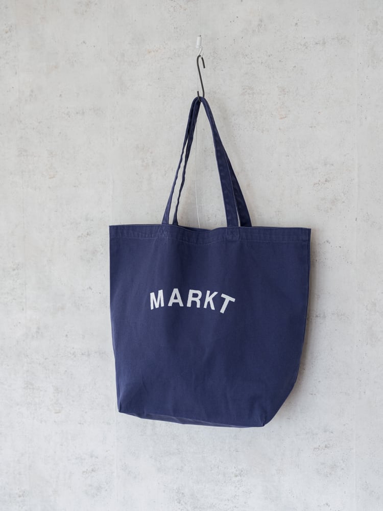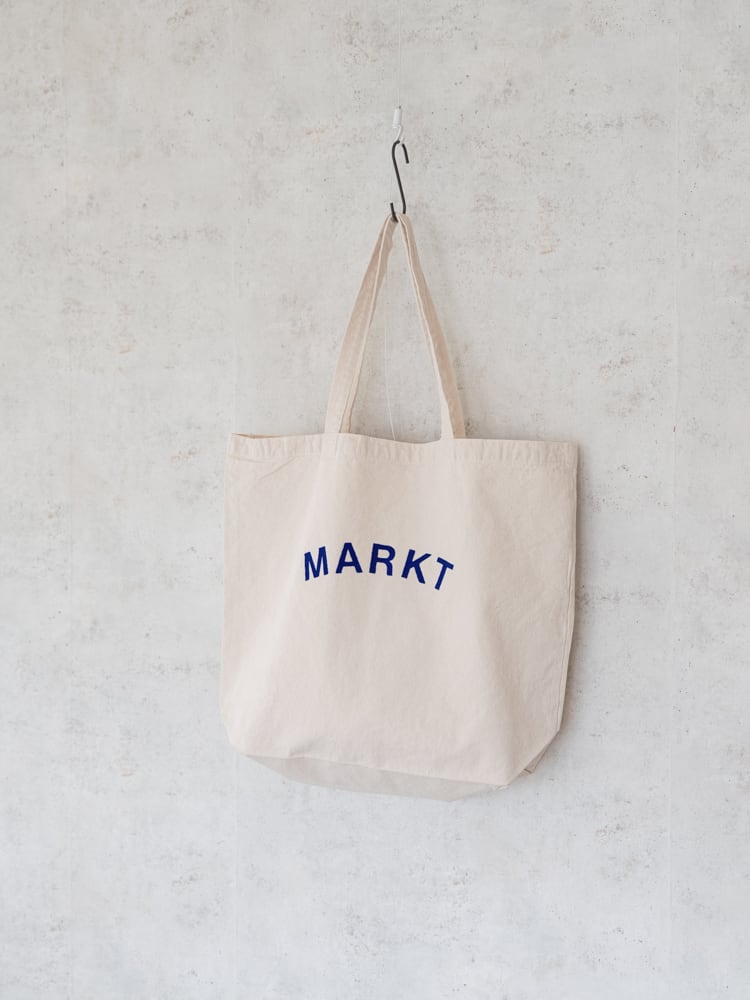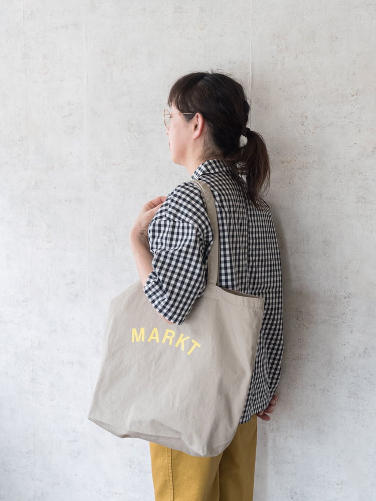 ベースの生地の色に合わせたMARKT(ドイツ語で広場や市場の意味)プリントは、よく見るとガタガタっとした手描きのフォントをフロッキープリントで施しています。