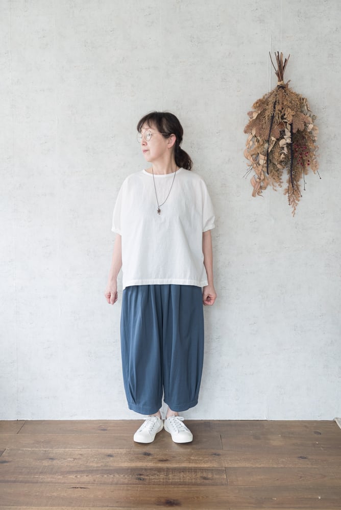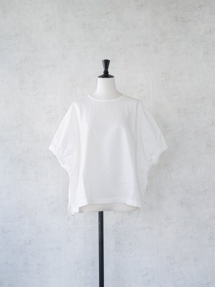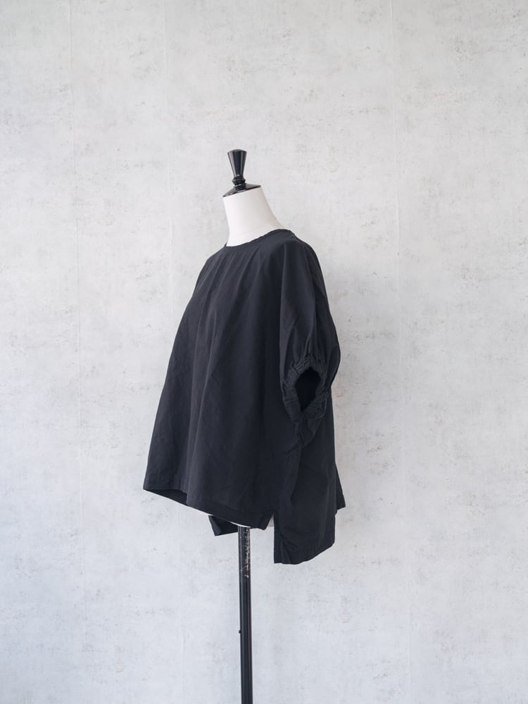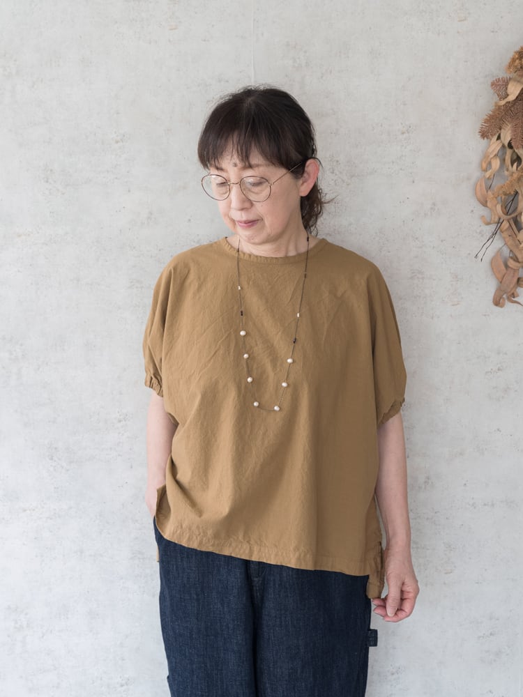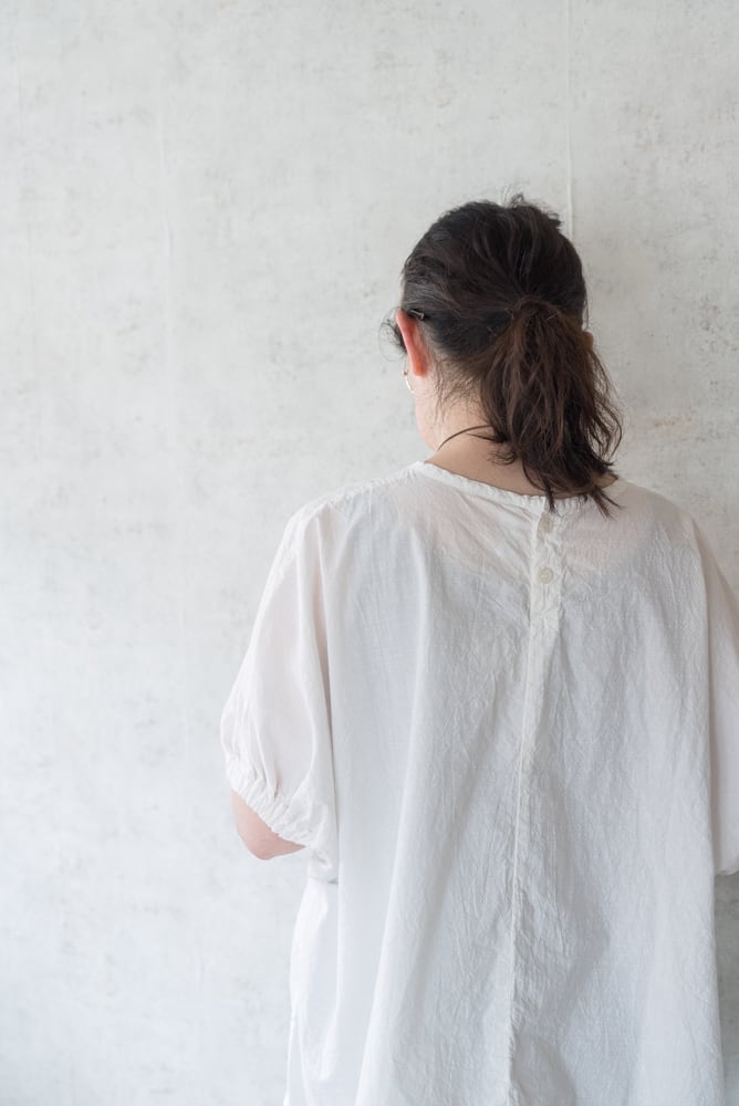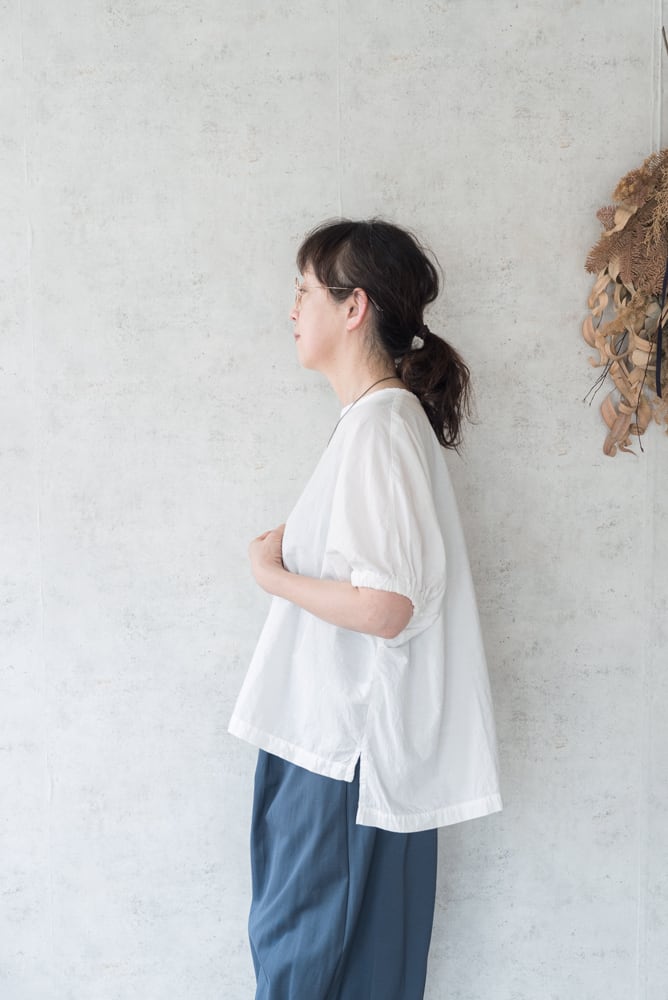 すっきりとしたクルーネックのラインから緩やかに落ちた袖がきれいで袖口のゴムシャーリングが目を引くポイントです。ゆとりを持たせたワイドな身幅が着やすく、ほんのりと前後差を付けた着丈と裾のスリットによって軽やかさと動きやすさをプラスしました。後ろの襟ぐりにはボタン2つ付いています。