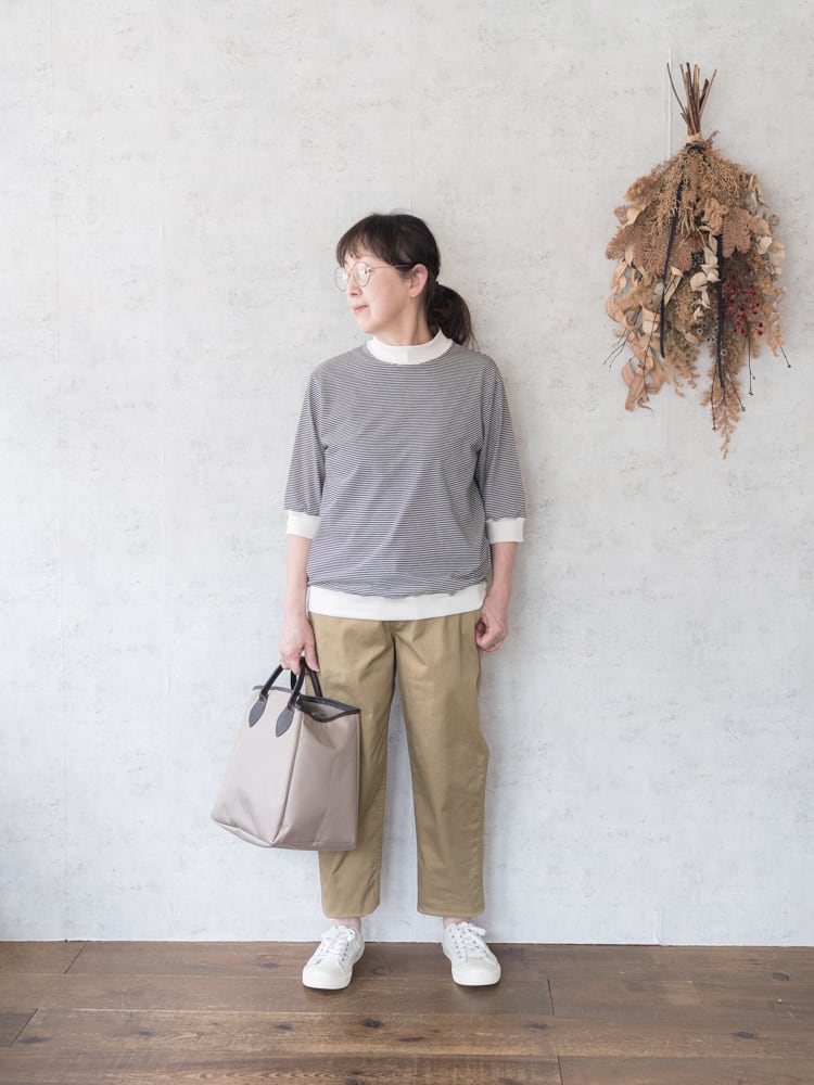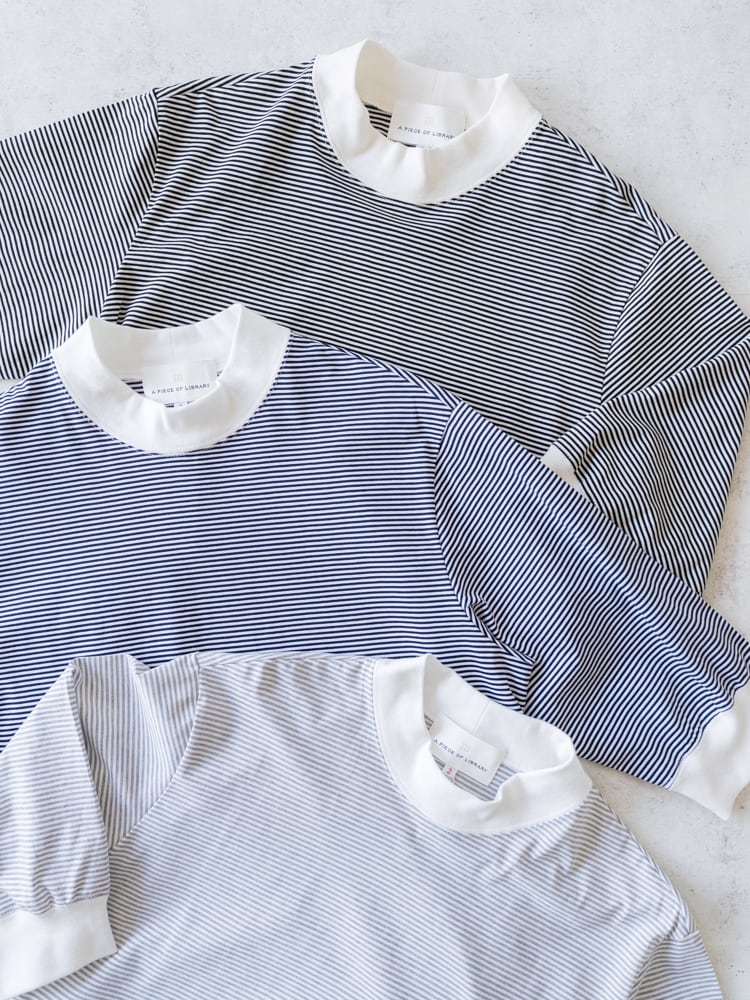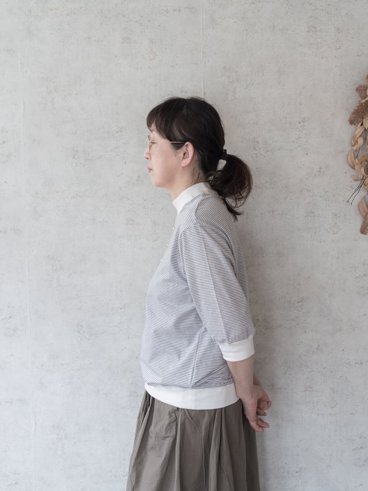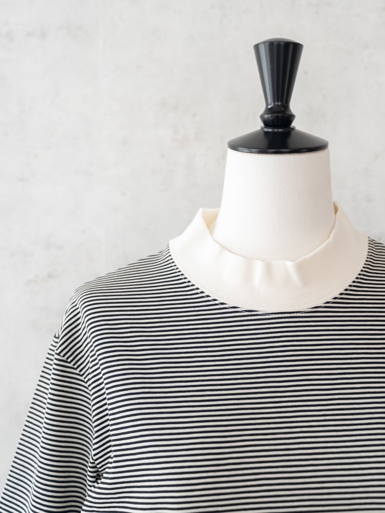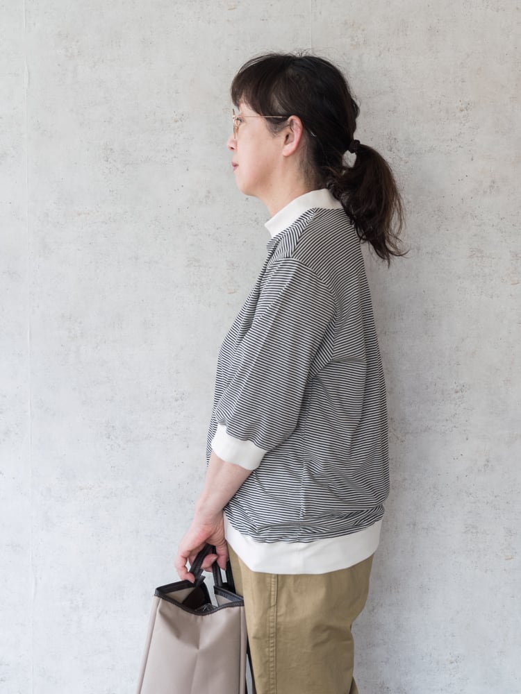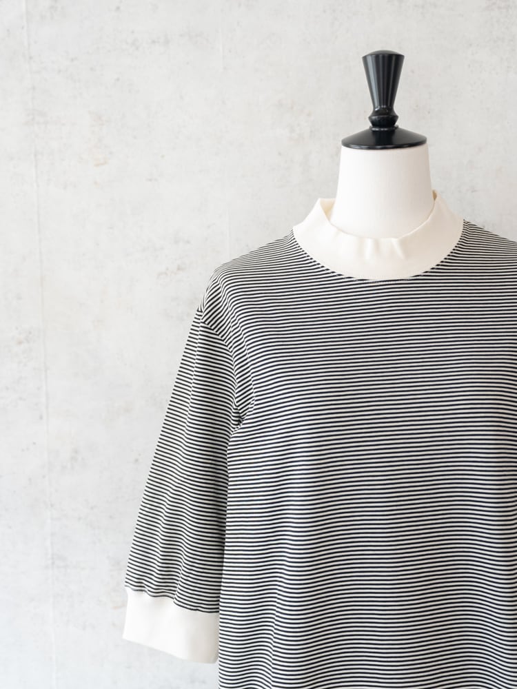 肘にかかる5分丈の袖と、首元を優しく包むモックネックが、落ち着いた大人の表情を見せてくれるプルミエボーダーヌーヴォーT。